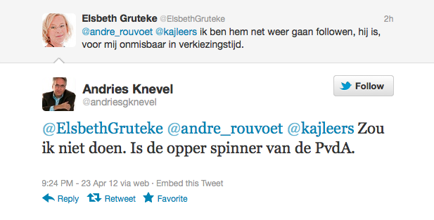 De aimabele Elsbeth Gruteke, presentator bij de EO, geeft aan mij te volgen op de twitters. Haar baas, de volstrekt neutrale EO-directeur en -presentator Andries Knevel, vond dat bepaald niet leuk.